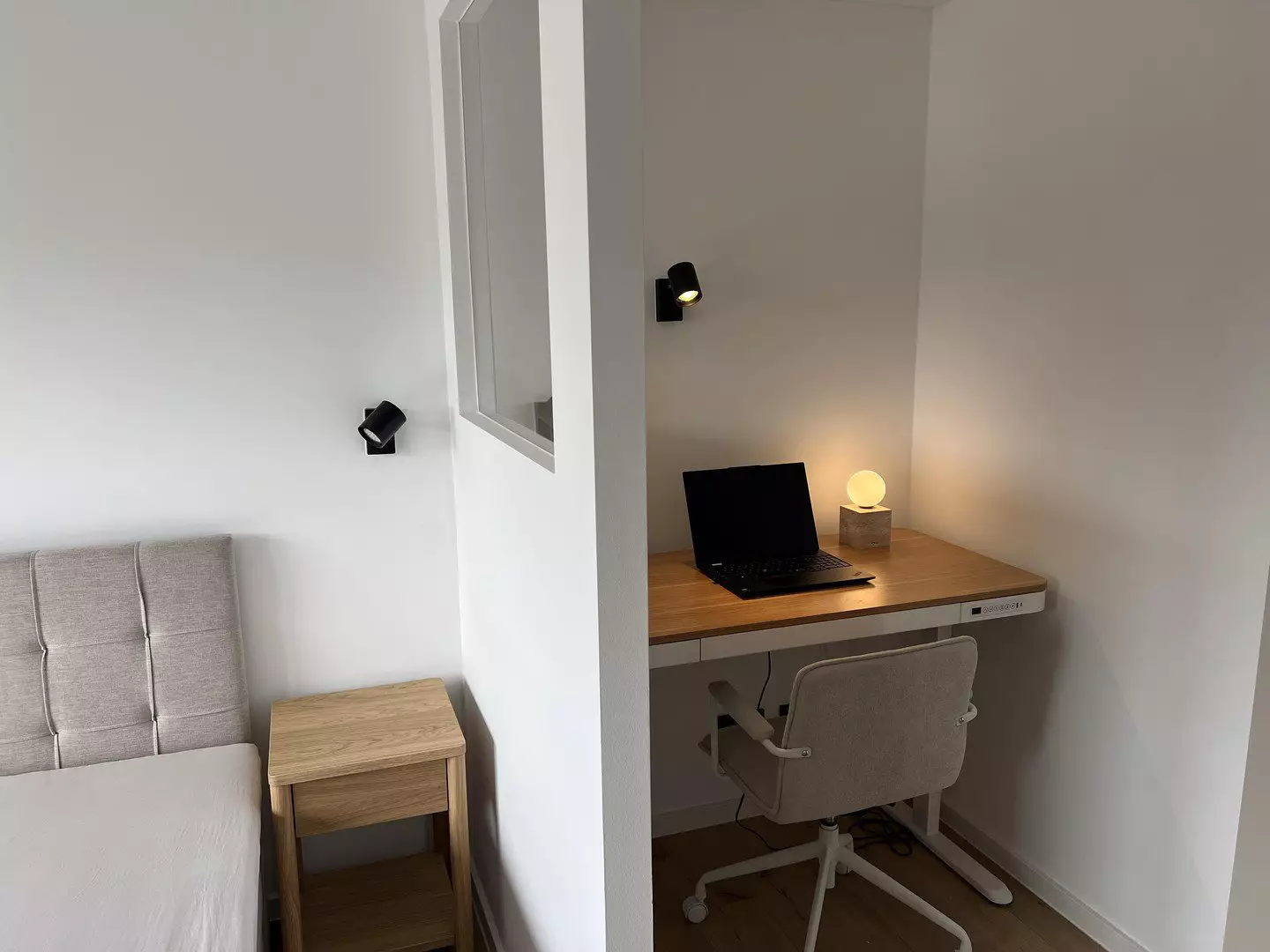 Home-Office: abgetrennte Nische mit Tageslicht, LAN-Direktanschluss, elektrisch höhenverstellbarem Schreibtisch.
