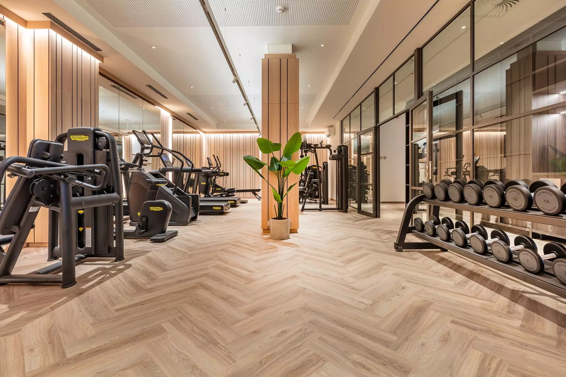 - Ein modernes Fitnessstudio mit modernen Technogym Geräten, Matten, Gewichten etc.
